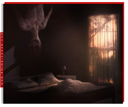 تبدو حاجز الستائر المكسور والضوء القادم من النافذة في غرفة النوم مثل "الابتسامة" التي رسمها غابرييل لتمثيل الكيان.